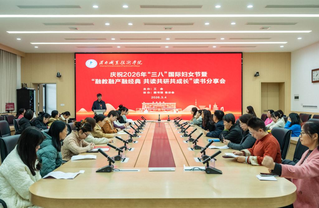 书香润桃李,巾帼绽芳华。在第116个“三八”国际劳动妇女节来临之际,3月4日下午,我校工会联合校图书馆在综合楼会议室以“融教融产融经典,共读共研共成长”为主题,隆重举办妇女节庆祝活动。活动分为读书分享与跳绳比赛两个环节,全校各分会女教职工代表工欢聚一堂,在书香与运动中共度美好节日。