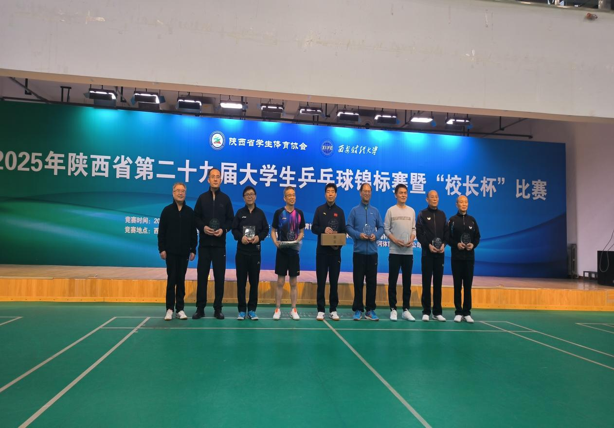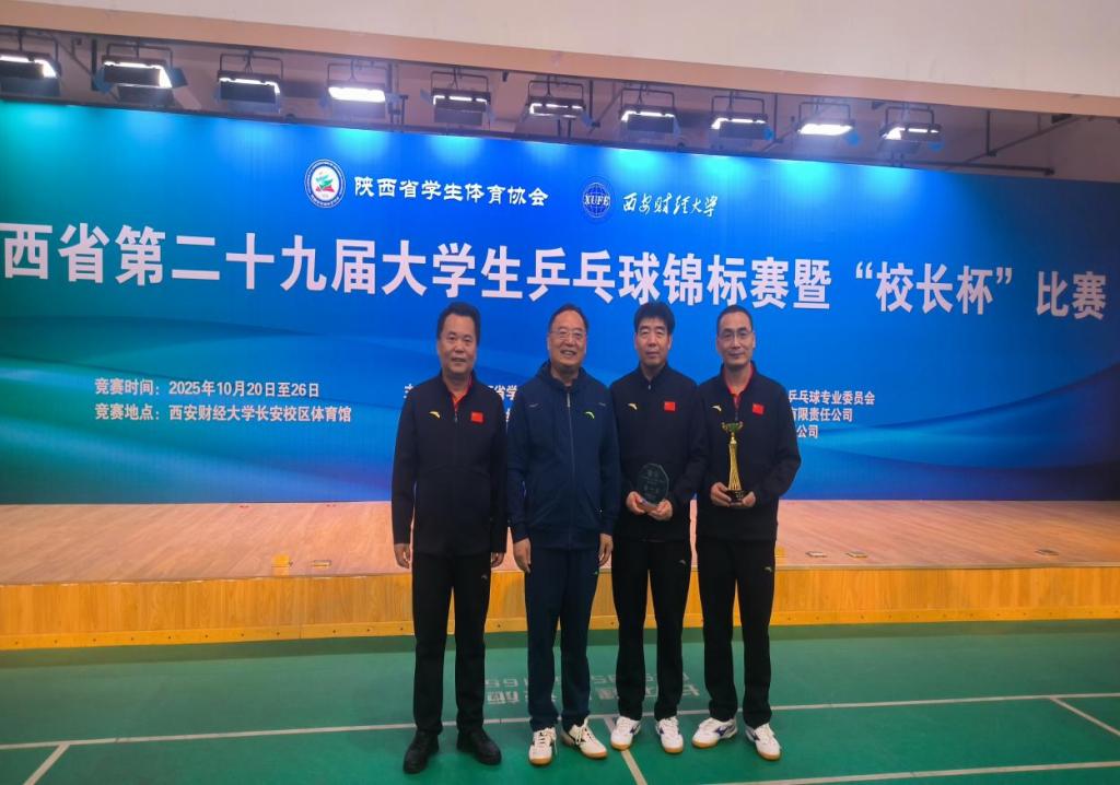 2025年10月25日—26日,由陕西省学生体育协会主办,西安财经大学承办的陕西省第二十九届“校长杯”乒乓球比赛在西安财经大学(长安校区)举行,共有来自31所高校的89名校级领导参赛。我院由副书记王录军、副院长王韦华、纪委书记张国栋和总会计师吴运胜组成代表队,参加比赛并荣获佳绩。